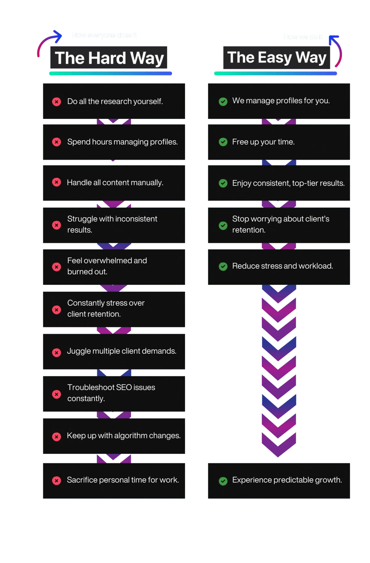 Benefit from our complete, step-by-step process for content creation,local link building, and citation management, designed to enhance your clients' GBP presence — all handled by our team.